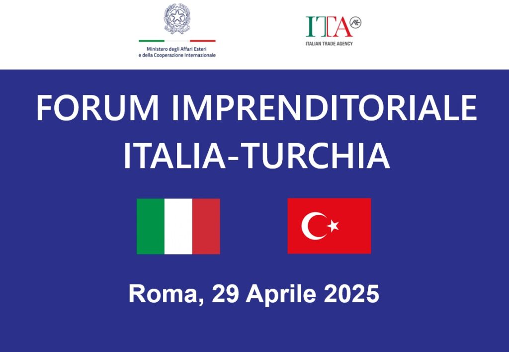 The Ministry of Foreign Affairs and International Cooperation and ICE Agency organize the Italy - Turkey Entrepreneurial Forum. The event will be held on April 29 in Rome at the Parco dei Principi Grand Hotel & SPA located in Via Gerolamo Frescobaldi 5, starting at 9:00.